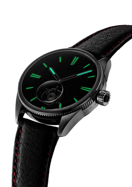 For the Lensman 1.1 tourbillon we have added the iconic red colour of the photography world to the dial and indices of the timepiece. Filled with red luminous, a red 60-minute marker and a reworked strap with a red underside.