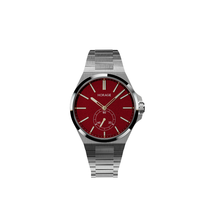 錶盤:深火紅色,香檳金鑽石切割時標,塗覆瑞士超級夜光塗層(Super LumiNova®)時標刻度,Horage標誌,6點鐘位置小秒針錶盤
