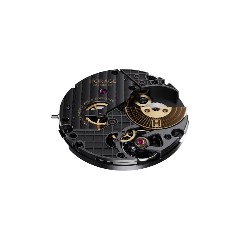 作為一款介於手工精緻和工業化量產之間的高性能機芯,K2的獨特裝飾令人印象深刻,黑金電鍍加上金色字樣,主夾板上飾有日内瓦波紋,Anglage倒角及半透視切口,標誌性的格網圖案元素設計,其靈感源自HORAGE品牌商標; 包含像是日內瓦波紋,拉絲處理,倒角等裝飾,這些全都是由手工所完成的。在微型自動盤方面,則是使用鎢鋼搭配金色電鍍,加上雷射雕刻仿造出磁磚風貌,來呼應HORAGE品牌商標,同時,表面也運用手工拉絲和抛光面來處理。除了鎢鋼,根據不同專案項目,我們也還在探索運用其他貴金屬的可能性。而機芯上鑲有23顆寶石,與黑色背景形成鮮明對比,創造出一種未來主義的氛圍。