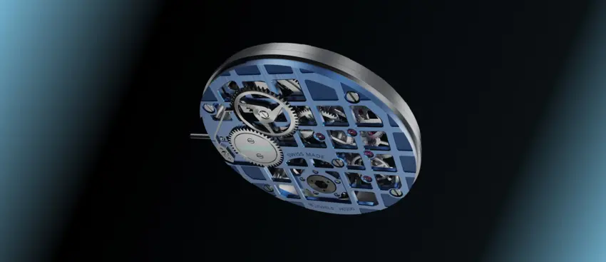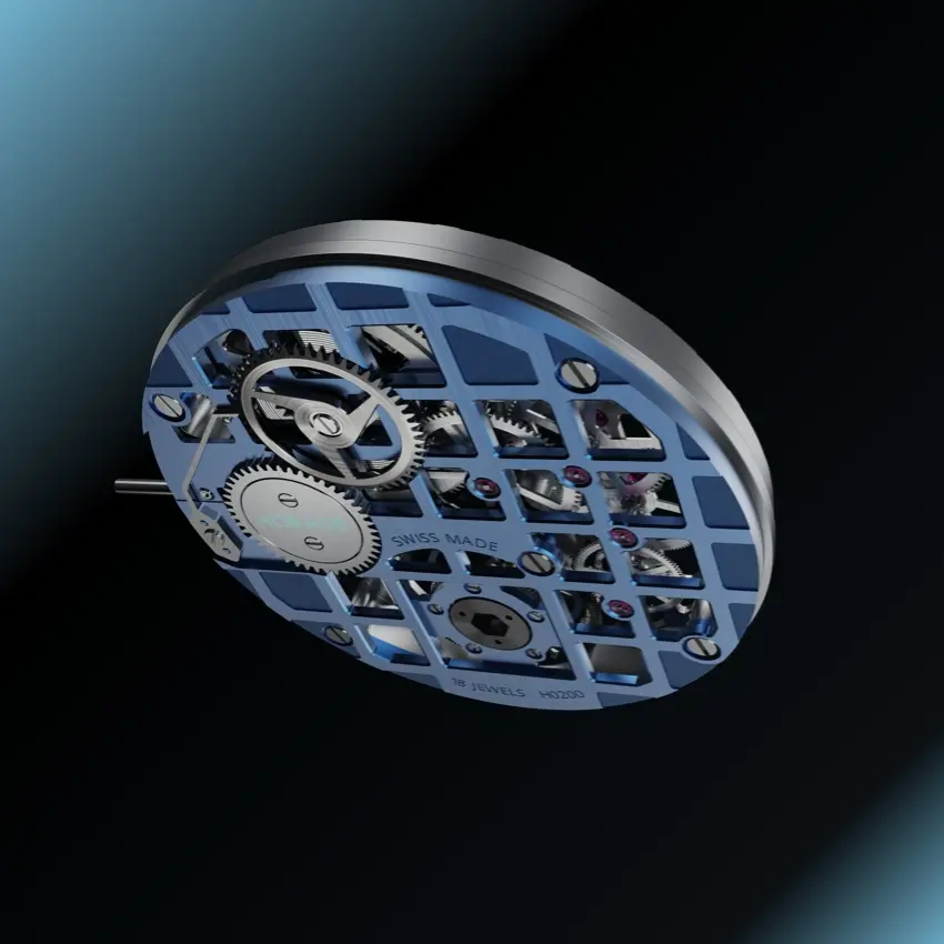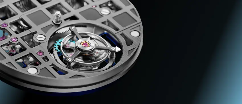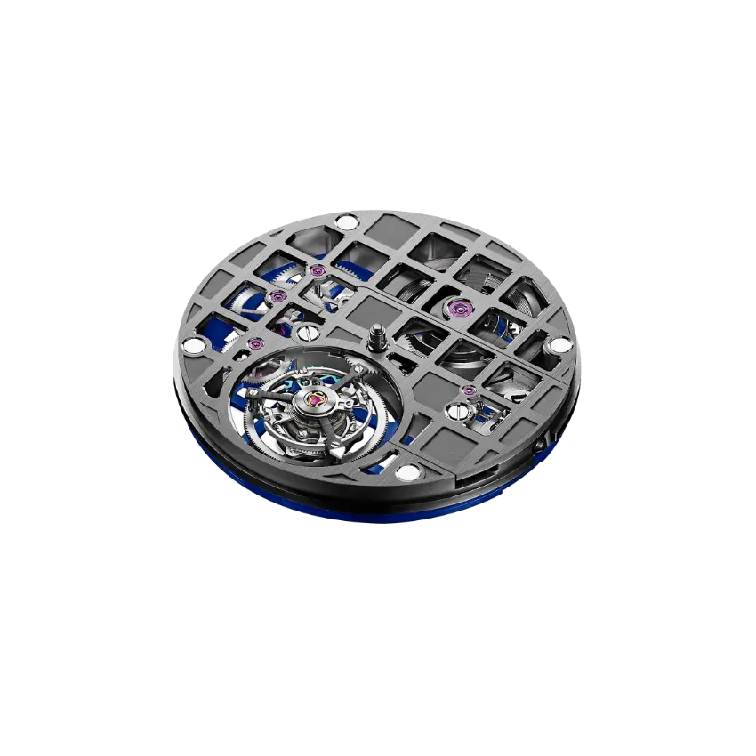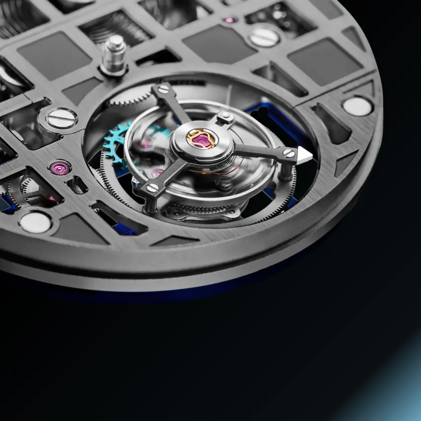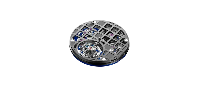 K-TOU是一款具有獨特美感的手動上鍊機芯。正面和背面都以『鏤空網格』組合,共有銀色、灰色、金色、藍色和藍/灰色組合(背面藍色、正面灰色)五款,可於預購時在線訂制,風格設計啟發來自品牌 HORAGE 標誌。主要的鏤空設計,在整個網格中都有打開和關閉的『窗口』,打開的方形部分有一個三十度角的拋光斜面,關閉的部分是低凹並經過噴砂處理。於十二點鐘位置清晰可見發條盒和發條,可當作類似的動力儲存指示。當然,表演的主秀位在六點鐘位置,飛行陀飛輪座落於直徑十四毫米的光圈裡。陀飛輪籠共有四十三個零組件,以穩定的滾珠軸承結構代替傳統的小齒輪與寶石的設計,這有助於提高耐用性同時提供日常佩戴的可靠性( 陀飛輪的易碎是眾所周知 )。 K-TOU 一共使用十九顆寶石,高於『完全寶石』的門檻數目十七顆,即性能壽命的最佳數量。同樣地,精準度在每天 -4/+6 秒的 COSC 瑞士官方天文台標準範圍內,官方 證書可加價選購。