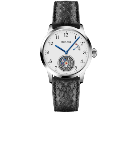 機芯表面飾有包括黑色 PVD 處理和標誌性的馬賽克圖案以及手工拉絲。陀飛輪發明於 1795 年,它將擺輪和擒縱機構整合在一個旋轉框架中,透過不斷移動調節零件的位置來抵消地心引力。這最終提高了精準度,尤其是在懷錶靜止不動地放在口袋裡的年代裡。儘管陀飛輪已有數百年的歷史,但它仍然是機芯中最難設計、製造和完善的複雜功能之一。 Horage 是當今極少數能夠開發全新陀飛輪機芯的獨立製錶品牌之一。