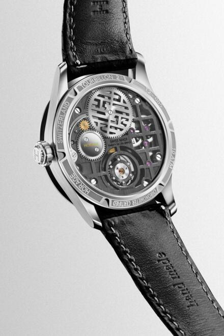 三個錶盤均採用手繪阿拉伯數字和刻度,靈感來自腕錶零件,大型飛行陀飛輪位於6點鐘位置。